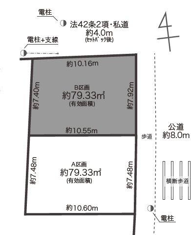 | 道路/接道状況 | A区画 東側 第42条第1項道路 (公道) 約7.48m接道 /B区画 北側 第42条第2項道路 (私道) 約10.16m接道 |