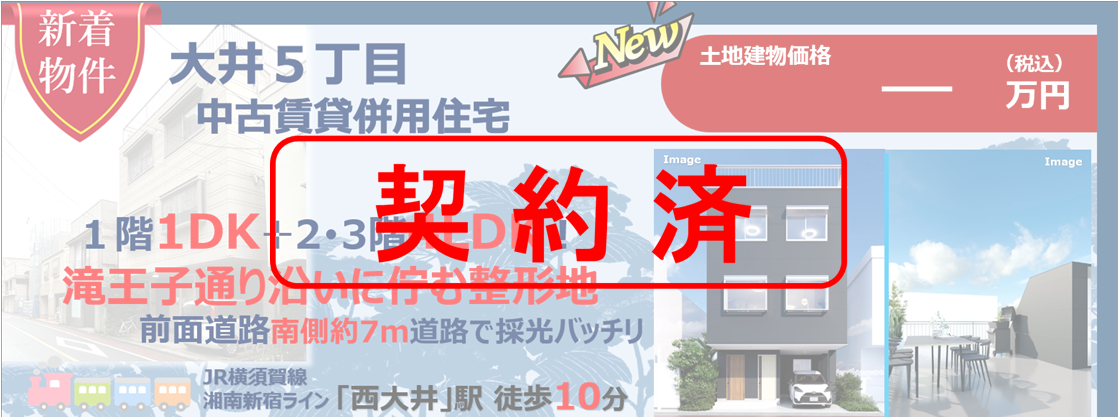 大井5丁目H-Ⅱプロジェクト 2階3階/約150㎡4LDK+屋上テラス・1階/約40㎡1DKにて、二世帯住宅や賃貸併用などの用途として使用可能!ヘーベルハウス鉄骨造!! 物件概要プロジェクト名称大井5丁目H-Ⅱプロジェクト価格-万円所在地品川区大井五丁目交通JR横須賀線「西大井駅」徒歩 10分、JR京浜東北線「大井町駅」徒歩 18分土地面積約95.57㎡(約28.91坪) ※実測面積建物構造鉄骨造3階建築年数平成3年4月床面積1階 / 44.93㎡ 2階 / 68.02㎡ 3階 / 68.02㎡ ※公簿面積間取り4LDK+屋上テラス / 1DK方位南地目 / 権利宅地 / 所有権用途地域近隣商業地域建蔽率 / 容積率80% / 400%防火指定 / その他地域地区防火地域 /滝王子通り地区地区計画日影規制 / その他制限指定なし道路 / 接道状況南側公道 幅員約8.6ⅿ / 接道約 7.17m現況居住中(売主にて2025年12月頃リノベーション予定)ライフライン公営水道 / 東京ガス / 東京電力 / 公共下水その他 取引形態売主引渡し時期2026年1月以降予定備考 お電話・FAXでのお問い合わせ 代表 03-3777-1711 FAX番号 03-3771-6831 メールアドレス sales@koide-fudosan.com