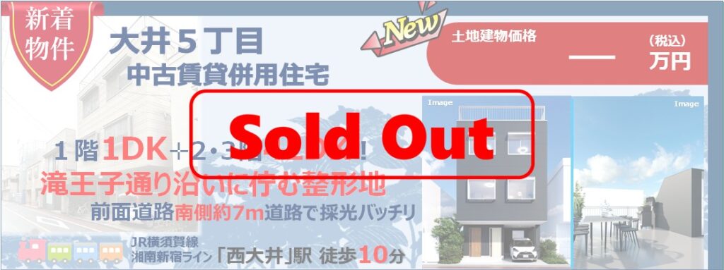 大井5丁目H-Ⅱプロジェクト 2階3階/約150㎡4LDK+屋上テラス・1階/約40㎡1DKにて、二世帯住宅や賃貸併用などの用途として使用可能!ヘーベルハウス鉄骨造!! 物件概要 プロジェクト名称 大井5丁目H-Ⅱプロジェクト 価格 -万円 所在地 品川区大井五丁目 交通 JR横須賀線「西大井駅」徒歩 10分、JR京浜東北線「大井町駅」徒歩 18分 土地面積 約95.57㎡(約28.91坪) ※実測面積 お電話・FAXでのお問い合わせ 代表 03-3777-1711 FAX番号 03-3771-6831 メールアドレス sales@koide-fudosan.com