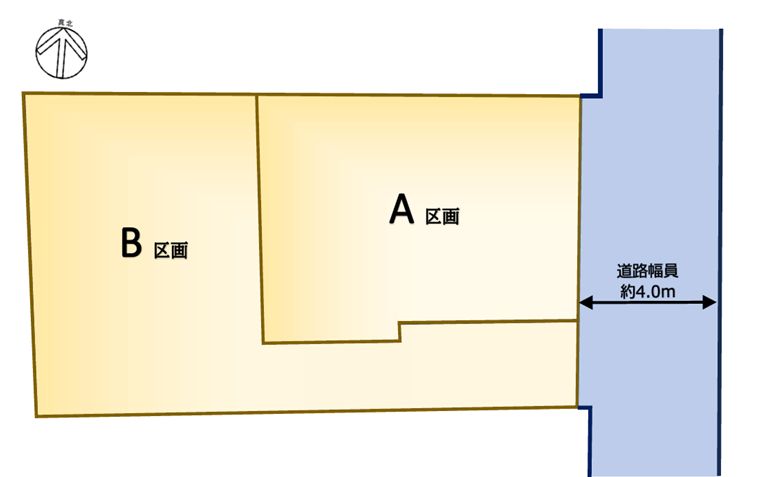 | 道路/接道状況 | 第42条2項道路(私道)約3.82m A区画 東側約8.9m接道 B区画 東側約2.5m接道 |